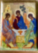 The subject is famous: three weary travelers sit at a table, a bowl of food in front of them. They are the Christian holy trinity—father, son and holy spirit—come down to earth in disguise. Sarah and Abraham–who appear in some versions of this icon–offer them food and wine, not knowing who they are. The icon is often entitled philoxenia–the Greek word for hospitality, which means literally, love of foreigners.
